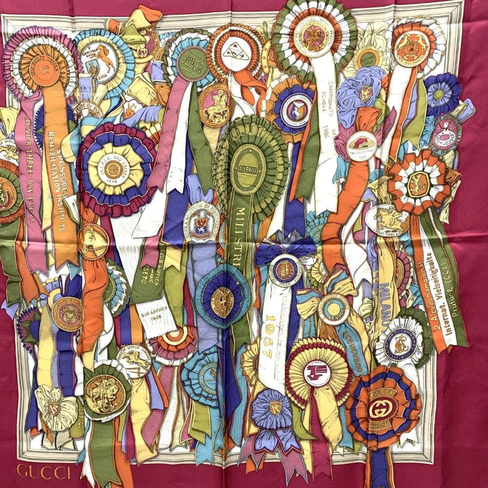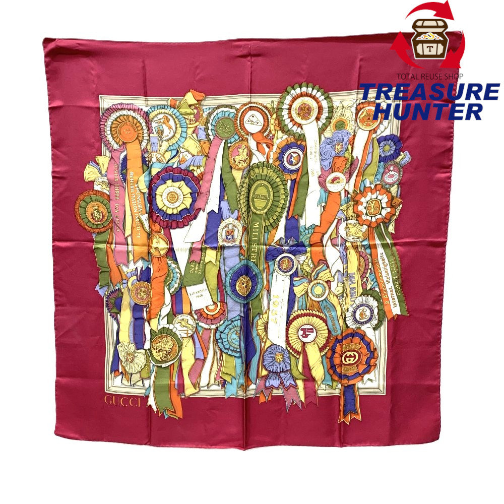 GUCCI(グッチ) リボン メダル柄 スカーフ シルク100% ワインレッド マルチカラー